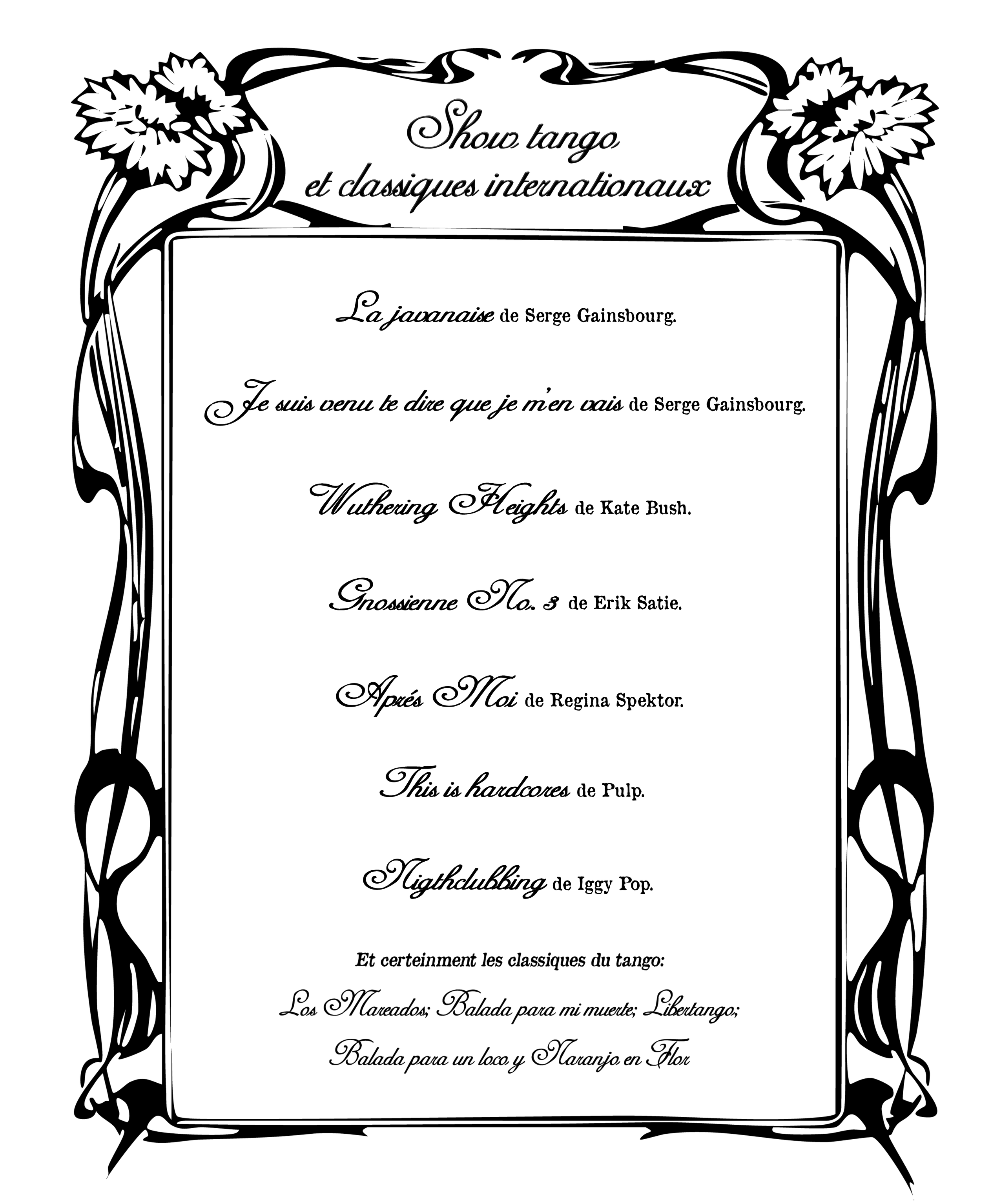 C’est pour cette raison que le tango prédominera toujours parmi les œuvres choisies, et que l’ouverture à des pièces internationales n’a lieu qu’à certaines occasions, afin d’enrichir et de moderniser le spectacle.